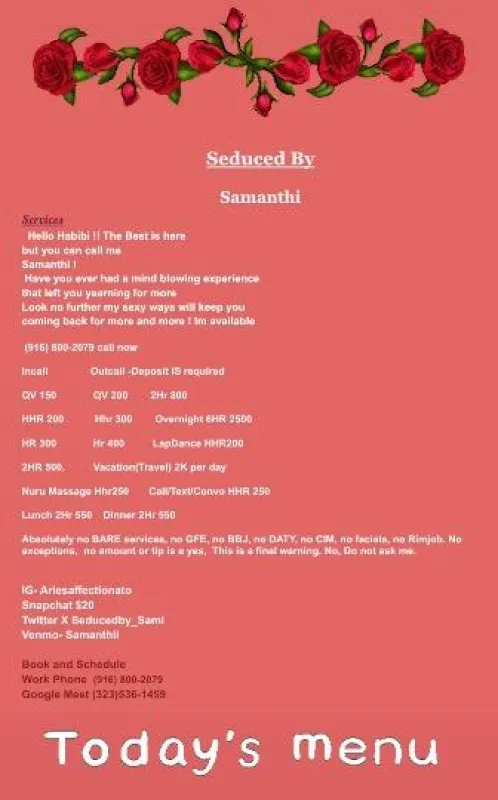 📸IG-Ariesaffectionato 🐥Twitter/X- Seducedby_Sami Rates in Pics, Read Bio Fully, Real Pics/Videos Text - Age, Race, City Available for Dates and Adult Services 🎄420 Friendly Only 💞 Safe Incall/ Outcall /Ft Available🤳 💰Cash/Venmo Only 💰 🚫No Aa /No Law/ No Pimps🚫 🚫NO Bare/GFE/DATY/BBj/ Kissing/NO🤢 💰Wealthy Serious Gentlemen Only Outcall Requires Small Booking Fee Santa Maria; Downtown, Entrada, NorthEast, NorthWest, Orcutt, Airport, Nipomo, Guadalupe, Arroyo Grande, San Luis Obispo